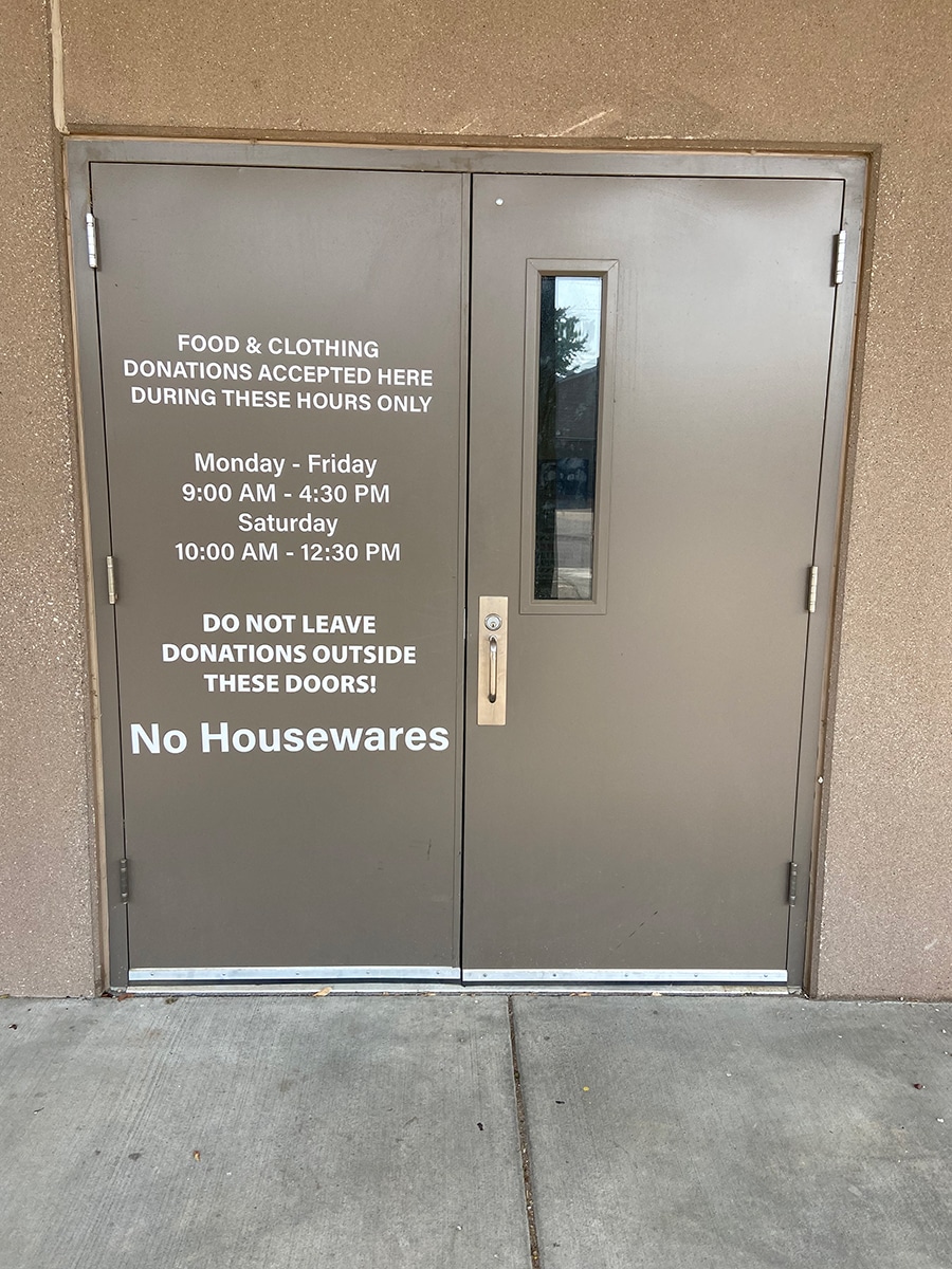 We have a designated entrance on the East side of the building near Laird Street for clothing and/or food donations. Please enter the drive-through off 2nd Street. Park under the overhang and bring your clothing and/or food donations inside the door and place in the designated area.
